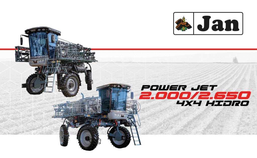 O Power Jet 2.000 Hidro, fabricado pela JAN, é um pulverizador autopropelido projetado para médias propriedades agrícolas que buscam alta eficiência, economia de insumos e precisão na aplicação de defensivos. Equipado com um tanque principal de 2.000 litros e tração 4×4 hidrostática Bosch Rexroth, este modelo garante estabilidade superior em terrenos variados e manobras precisas graças ao piloto automático hidráulico e à direção hidrostática bidirecional.